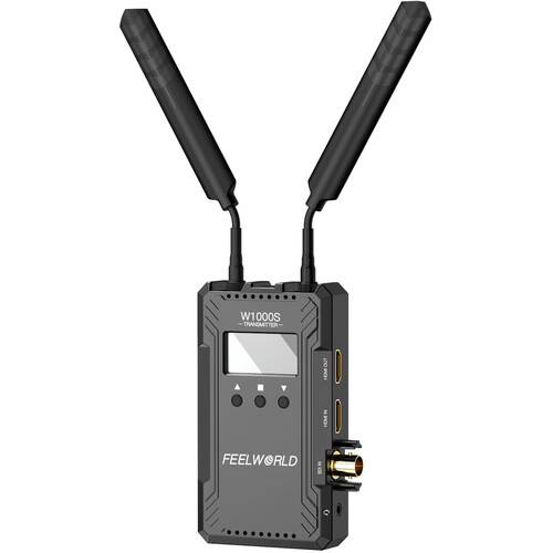 The FeelWorld W1000S transmitter/receiver set is a real-time wireless video transmission system with an integrated intercom feature that allows communication between users on set. The system supports up to 1080p60 SDI/HDMI transmission up to 1000′ with a low latency of 0.08 seconds. The transmitter has a 3G-SDI input and HDMI input and output. The receiver offers a 3G-SDI output and dual HDMI outputs.
